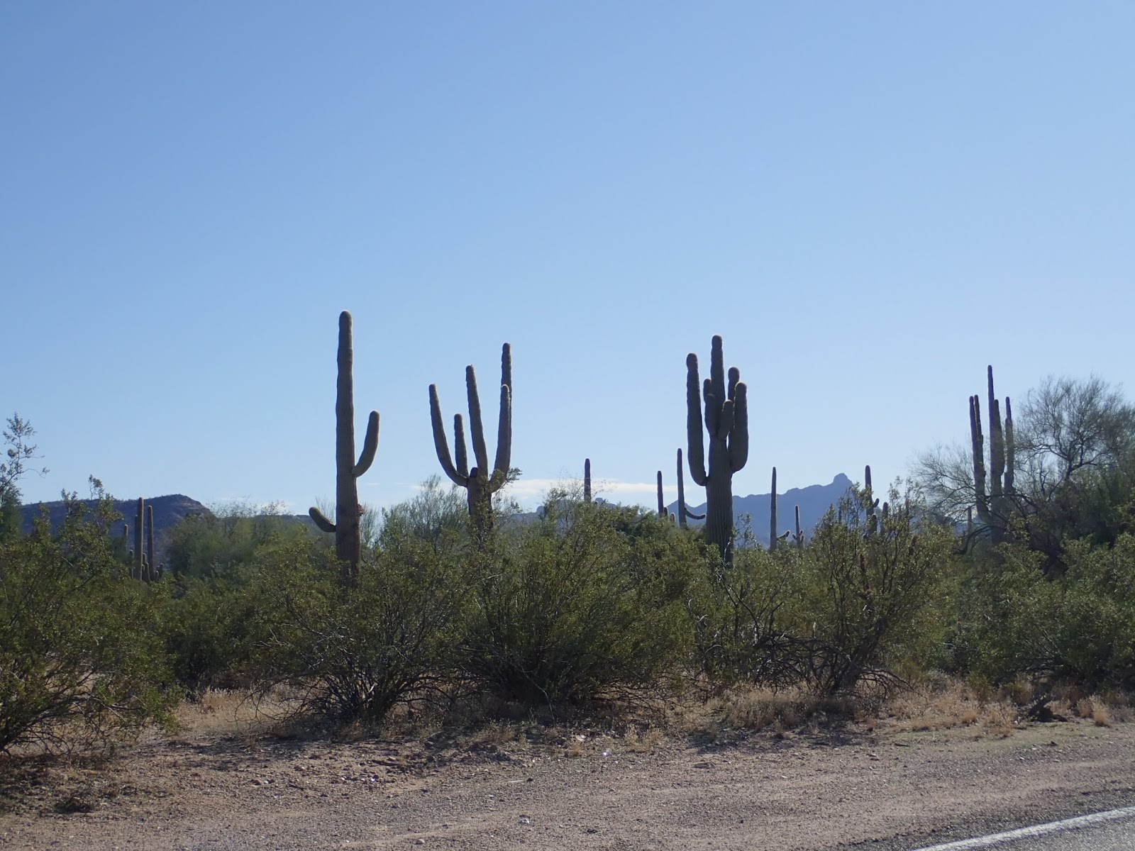 We left Margaret and rode 37 miles to Organ Pipe Cactus National Monument where we camped for the night in Twin Peaks Campground. Everything about the day was stunning. We saw not just the occasional saguaro but hundreds of them, stretching out forever. And ocotillo and cholla. Then after we entered the park, we began seeing organ pipe cactus.
